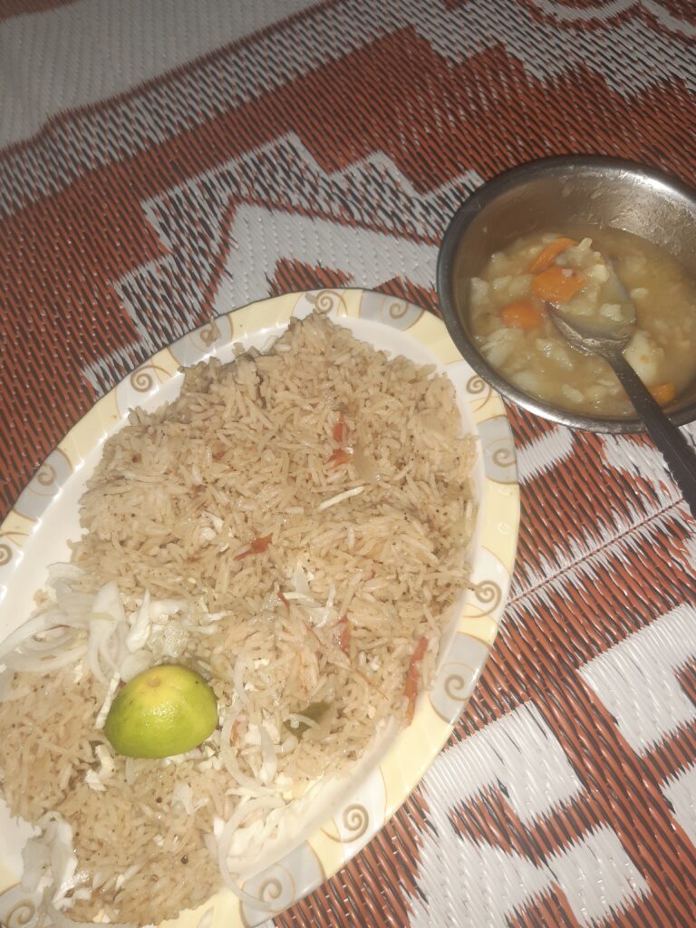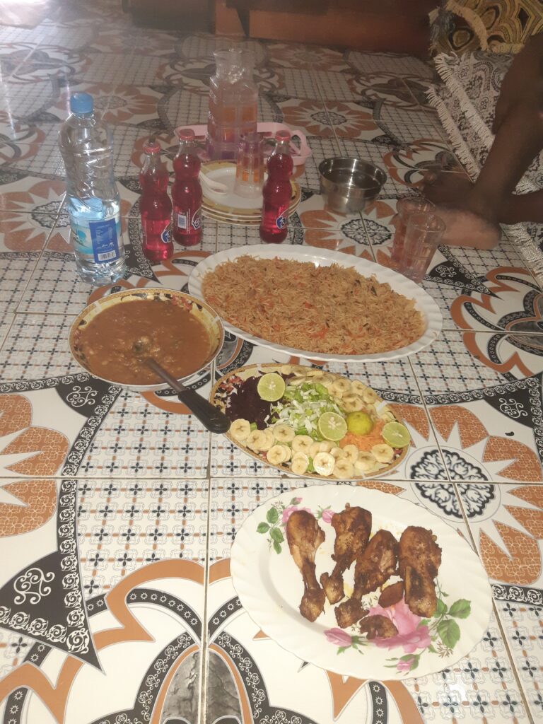 Ici on adore les bananes on en mange dans TOUT : avec les « pastas », le riz.. accompagnées d’œufs, de poulet ou de thon. Beaucoup de pomme de terre, de haricot, de samBoussa, les khamirs (beignets légèrement sucrés que l’on trempe dans du piment), la soupe fahfah (bouillon de légume avec de la viande), Fahdira, Sabaya…