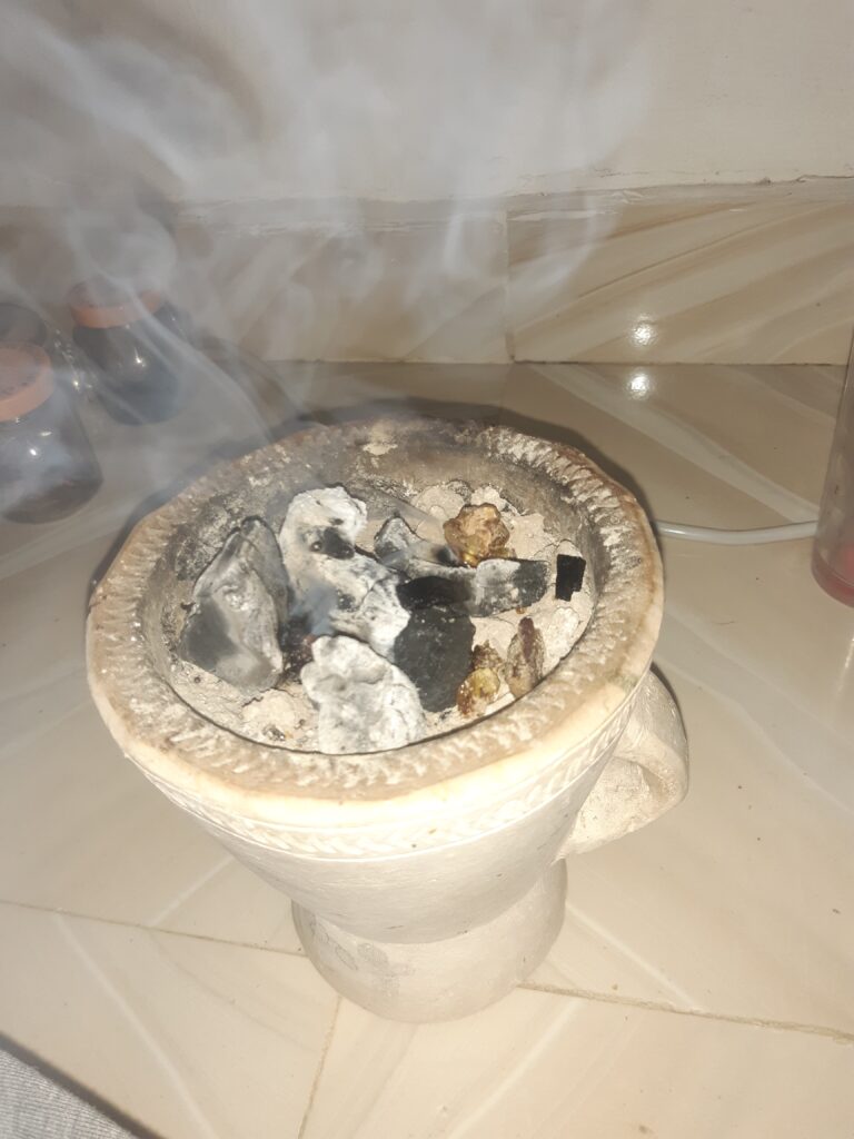 Le Fooh ! on en fait bruler tous les jours, c’est de la Myrrhe, ça fait beaucoup de fumée, ça apaise et chasse tout ce qui est mauvais.