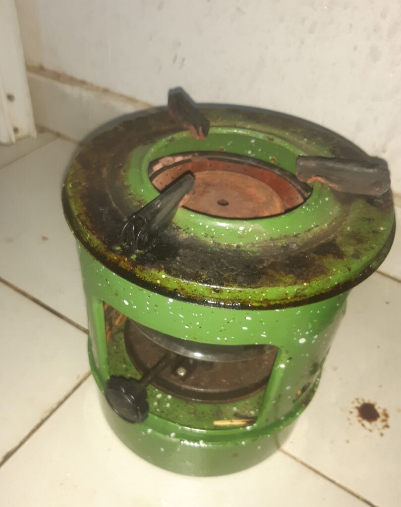 « Farrissa » (assied toi), on cuisine assis à terre, avec notre petit réchaud, qu’on recharge au gaz…. du KEROSENE. Il existe aussi le proxygaz, c’est 3 fois plus rapide, c’est une bouteille de gaz adaptée pour la cuisine. Sinon traditionnellement c’est un récipient en céramique qui est utilisé, dans lequel le charbon est mis.