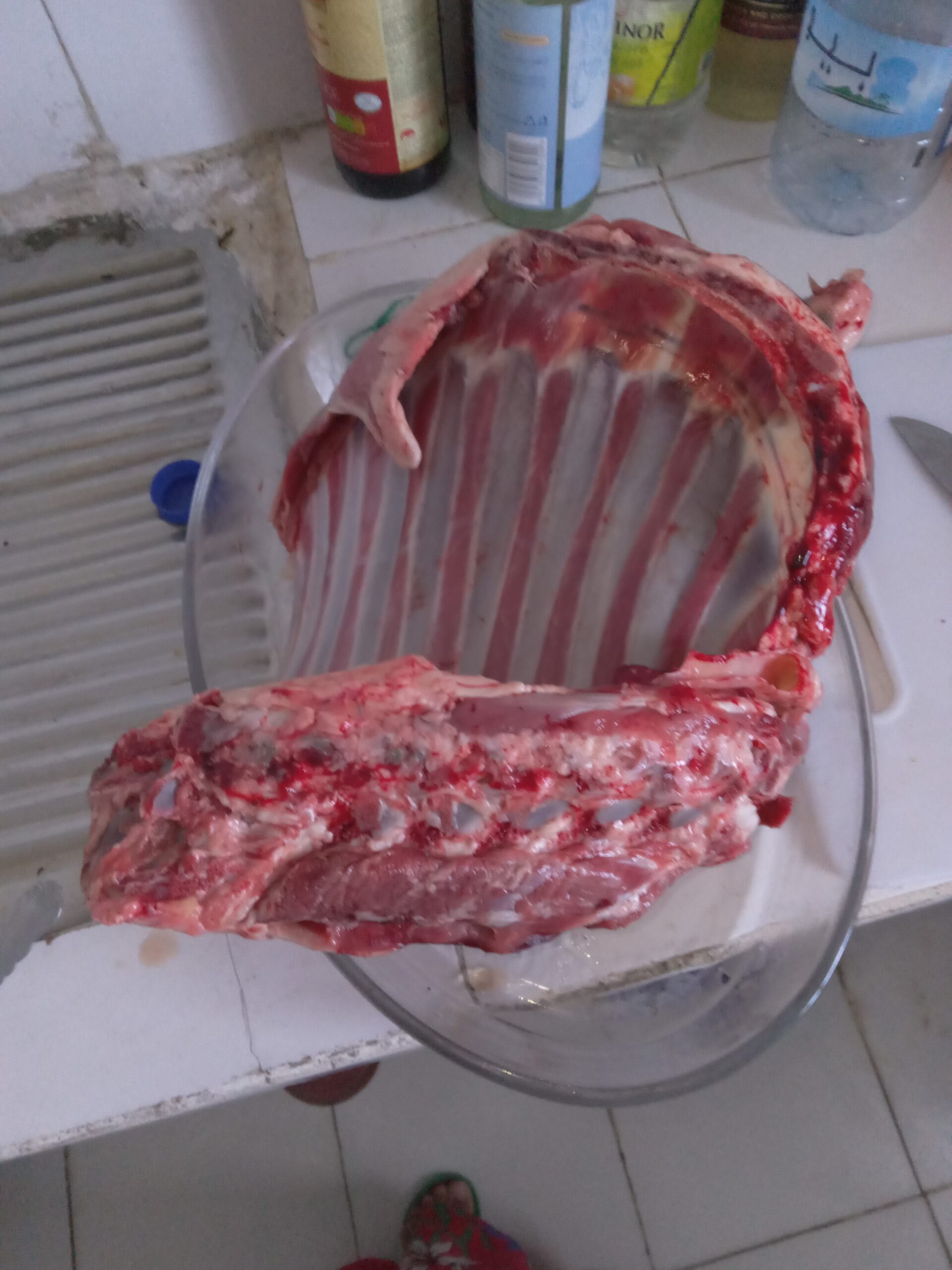 Pour L’Aïd mes voisins m’ont offert de la viande… comme ça !! J’avais simplement un petit couteau, qui se tort quand on force trop. Donc ma voisine m’a aidée pour tenir la viande de chaque côté, l’étirer, et la couper !