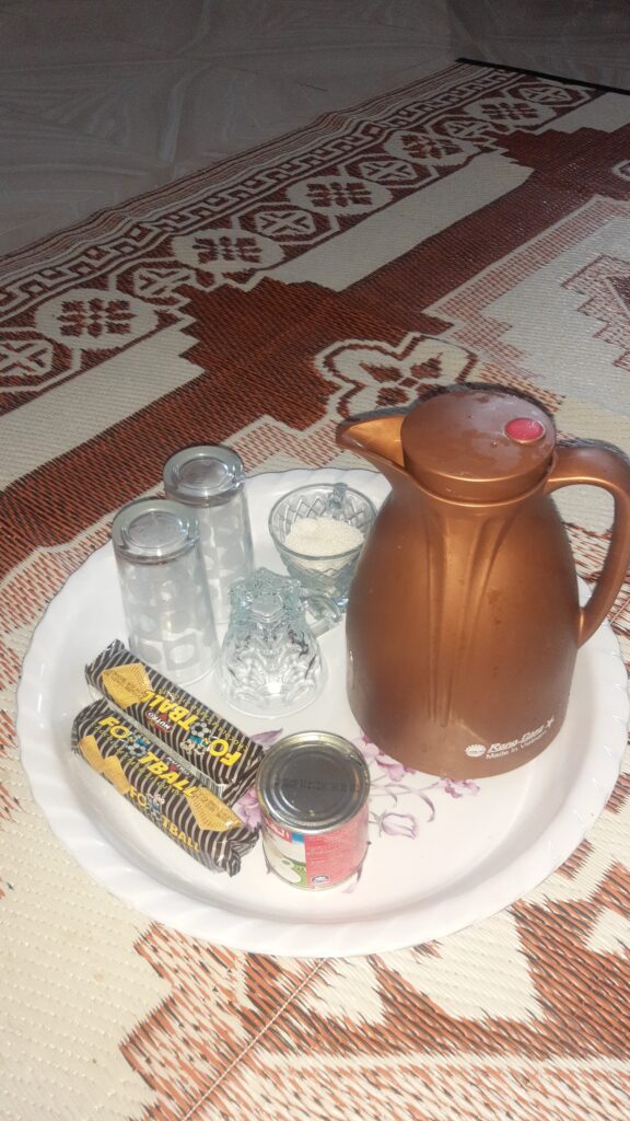 Le matin c’est la Galette (mélange de farine, eau, sel et de la pâte de la veille, on tape fort la pate. On laisse poser la nuit, pour préparer le lendemain). On mange ces galettes en les trempant dans du thé au lait, ou on les mange avec du « beer » (du foie d’agneau).